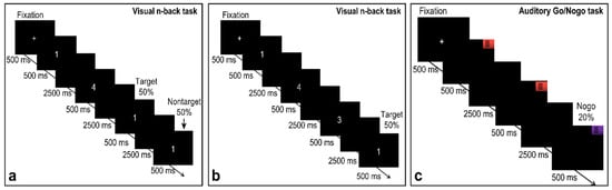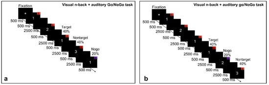 - Breitling-Ziegler, C.; Tegelbeckers, J.; Flechtner, H.-H.; Krauel, K. Economical assessment of working memory and response inhibition in ADHD using a combined n-back/nogo paradigm: An ERP study. Front. Hum. Neurosci. 2020, 14, 322. [Google Scholar] [CrossRef] [PubMed]