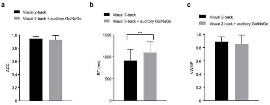 In the 2-back conditions, (a) single-task (visual) and dual-task (audiovisual interaction) groups for accuracy (ACC); (b) single-task (visual) and dual-task (audiovisual interaction) groups for reaction time (RT); (c) as well as single-task (visual) and dual-task (audiovisual interaction) groups for performance data (visual working memory performance, VWMP). Between the single-task (visual) and dual-task (audiovisual interaction) groups revealed that the RT in the dual visual 2-back + auditory Go/NoGo task was significantly longer than that in the single visual 2-back task. All the data are presented as the mean ± S.D (n = 44); *** p < 0.001.