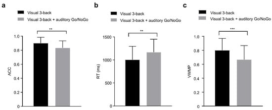 In the 3-back conditions, (a) single-task (visual) and dual-task (audiovisual interaction) groups for accuracy (ACC); (b) single-task (visual) and dual-task (audiovisual interaction) groups for reaction time (RT); (c) as well as single-task (visual) and dual-task (audiovisual interaction) groups for performance data (visual working memory performance, VWMP). There were differences in ACC and RT as well as VWMP between the single-task group (visual) and the dual-task (audiovisual interaction) group. All the data are presented as the mean ± S.D (n = 44); ** p < 0.01, *** p < 0.001.