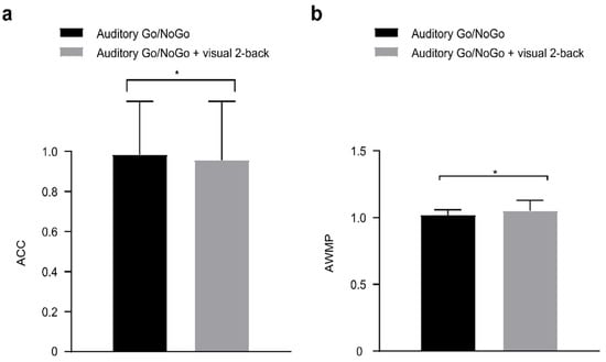 In the visual 2-back interference condition, (a) single-task (auditory) and dual-task (audiovisual interaction) groups for accuracy (ACC); (b) single-task (auditory) and du-al-task (audiovisual interaction) groups for performance data (auditory working memory performance, AWMP). Between the single auditory Go/NoGo task and the dual auditory Go/NoGo + visual n-back task revealed significant differences, p < 0.05. All the data are presented as the mean ± S.D (n = 44); * p < 0.05.