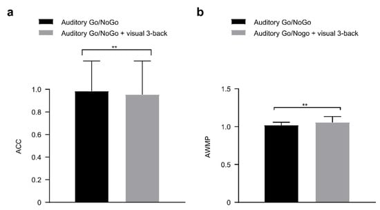 In visual 3-back interference conditions, (a) single-task (auditory) and dual-task (audiovisual interaction) groups for accuracy (ACC); (b) single-task (auditory) and dual-task (audiovisual interaction) groups for performance data (auditory working memory performance, AWMP). Between the single auditory Go/NoGo task and the dual auditory Go/NoGo + visual n-back task groups revealed significant differences, p < 0.01. All the data are presented as the mean ± S.D (n = 44); ** p < 0.01.