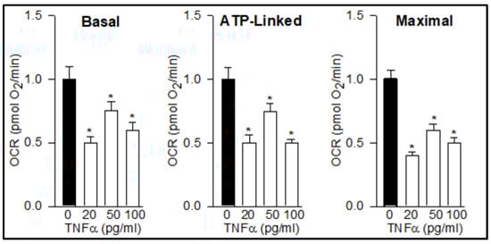 The treatment of hypothalamic NPCs with TNFα for 24 h impaired mitochondrial function, as evidenced by reduced basal, ATP-linked, and maximal OCR at all three doses with ~50% reduction at doses 20 and 100 pg/mL (Figure 1).