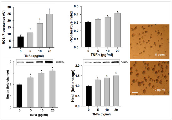 TNFα Increases NPC ROS and Promotes Proliferation. Hypothalamic NPCs were treated with various doses (5, 10, and 20 pg/mL) of TNFα in complete medium for 24 h. Values are (Mean ± SEM of n = 4 independent experiments with each treatment performed in duplicate) normalized to untreated control cells and expressed as fold change. For protein expression, representative immunoblots are shown. Images of untreated (0 pg/mL) and TNFα-treated (10 pg/mL) cells (×20; scale bar = 50μm). * p < 0.05 vs. untreated cells.