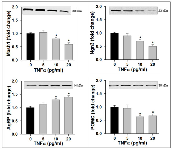 In view of the 50% reduction in mitochondrial function at 20 pg/mL TNFα, our subsequent studies used lower doses of TNFα (≤20 pg/mL). With increasing TNFα doses in complete medium, NPCs exhibited increased levels of ROS with an increased expression in Hes1. Consistent with this, there was a dose-dependent increase in proliferation and Nestin expression (Figure 2). However, in differentiation medium, TNFα treatment (10 and 20 pg/mL) resulted in the decreased protein expression of Mash1 and Ngn3 with a corresponding increased AgRP and decreased POMC (Figure 3).