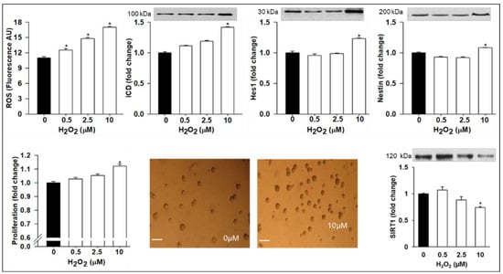 H2O2 Promotes ROS Production and Upregulates NPC Notch/Hes1 Pathway and NPC Proliferation with Downregulation of SIRT1. Hypothalamic NPCs were treated with various doses (0.5, 2.5, and 10 µM) of H2O2 in complete medium for 24 h. Values are (Mean ± SEM of n = 4 independent experiments with each treatment performed in duplicate) normalized to untreated control cells and expressed as fold change. For protein expression, representative immunoblots are shown. Images of untreated (0 µM) and H2O2 treated (10 µM) cells (×20; scale bar = 50 μm). * p < 0.05 vs. untreated cells.