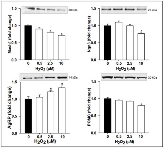 H2O2 Reduces NPC Proneurogenic bHLH Genes and Alters Neuropeptide Expression. Hypothalamic NPCs were treated with various doses (0.5, 2.5, and 10 µM) of H2O2 in differentiation medium for 24 h. Values are (Mean ± SEM of n = 4 independent experiments with each treatment performed in duplicate) normalized to untreated control cells and expressed as fold change. For protein expression, representative immunoblots are shown. * p < 0.05 vs. untreated cells.