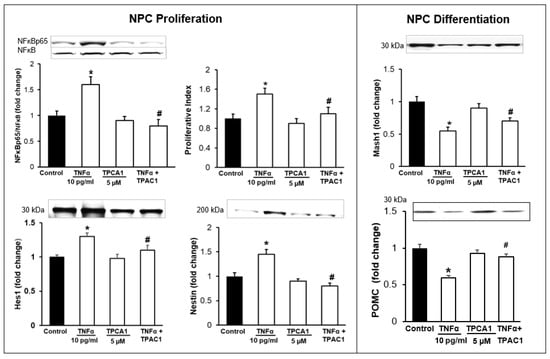 Effects of NFĸB Inhibitor (TPCA1) on NPC Proliferation/Differentiation. Hypothalamic NPCs were treated with TNFα (10 pg/mL), TPCA1 (5 µM) and TNFα + inhibitor in complete or differentiation medium for 24 h. Values are (Mean ± SEM of n = 4 independent experiments with each treatment performed in duplicate) normalized to untreated control cells and expressed as fold change. * p < 0.05 vs. untreated cells; # p < 0.05 TNFα + TPAC1 vs. TNFα.
