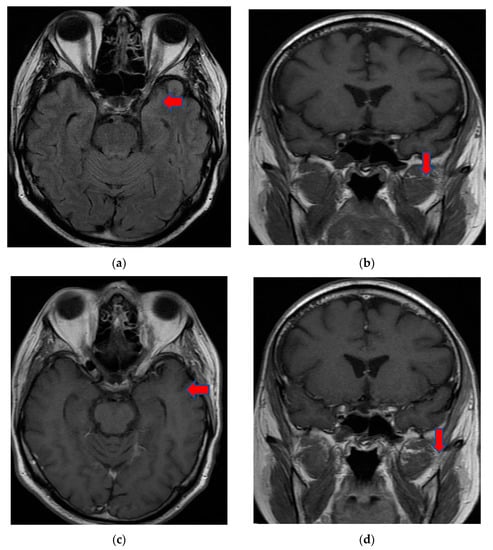 MRI brain images with contrast showed aspects of T2 axial Flair hypersignal in the left temporal lobe (a,b), respectively, in the hippocampal and parahippocampal region (c). The lesion is hyperintense on the DWI axial image (d). MRI: magnetic resonance imaging; Flair: fluid attenuated inversion recovery; DWI: diffusion weighted imaging.
