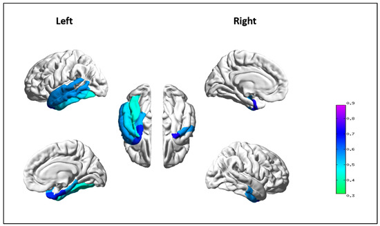 - Desikan, R.S.; Ségonne, F.; Fischl, B.; Quinn, B.T.; Dickerson, B.C.; Blacker, D.; Buckner, R.L.; Dale, A.M.; Maguire, R.P.; Hyman, B.T.; et al. An Automated Labeling System for Subdividing the Human Cerebral Cortex on MRI Scans into Gyral Based Regions of Interest. Neuroimage 2006, 31, 968–980. [Google Scholar] [CrossRef]