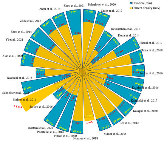 | Devanathan et al., 2016 [22] # | Single-blind, cross | A-tDCS = sham = 14, (6 M/8 F), 7–9 days | 20–32 | One; 12.5/35 | M1/SA | To investigate the lower-limb simple reaction time and choice reaction time and to complete symbol digit modality test |