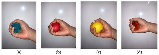 First, we selected different types of objects that were expected to give the participants different feelings when they grasped them. We chose four different types of objects (Figure 1): Object 1, a ball with warts (Φ6 cm, weight 40 g, PVC material); Object 2, a squeezable ball (Φ6 cm, weight 132 g, silicone); Object 3, a regular hard ball (Φ6 cm, weight 73 g, Rubber); and Object 4, Slime (Φ6 cm, weight 118 g). We also estimated the different kinds of feelings each object would produce: Object 1 (a ball with warts), comfort or pain; Object 2 (a squeezable ball), comfort; Object 3 (a regular hard ball), hardness; and Object 4 (slime), discomfort. These were expected to show different activity in different brain regions.