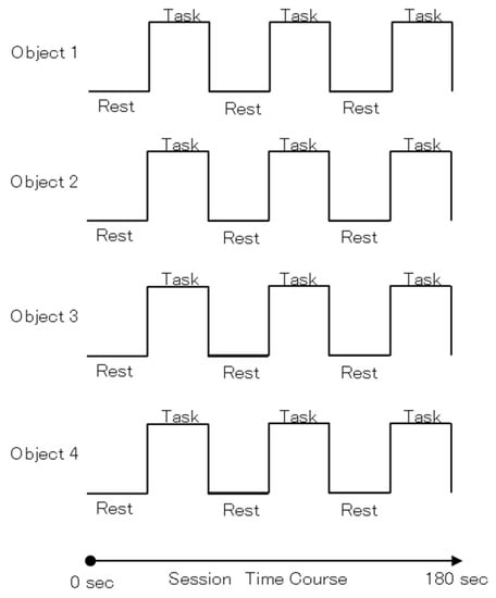 Block design of the stimulus task: 30 s, 30 s per task, three intervals per object.