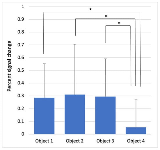 The results of the calculation of the PSC in the ROI, to observe the different brain activity for each object, are presented in Table 3 and Figure 3. A significant difference was noted in the anterior insula (p < 0.001). The other regions did not show a significant difference in the brain activity for each object.