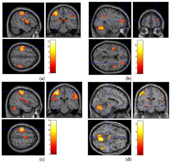The images of the brain activation while grasping each object. (a) Object 1: Left postcentral gyrus (b) Object 2: Right middle frontal gyrus; (c) Object 3: Left postcentral gyrus; (d) Object 4: Left ventral diencephalon.