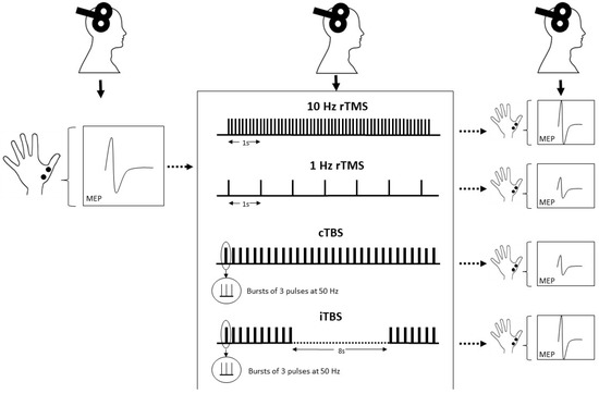 More recently, new rTMS protocols that use “patterned” forms of rTMS have been developed. Theta burst stimulation (TBS) is the most commonly used form and consists of bursts of three pulses at 50 Hz, repeated at intervals of 200 ms [53]. This protocol is based on the naturally occurring theta rhythm (5 Hz) of the hippocampus and has been shown to induce synaptic plasticity in animal experiments [54]. TBS can be delivered as a single train of bursts lasting 20–40 s (continuous TBS (cTBS)) which has a primarily inhibitory effect on cortical excitability, for instance, 40 s of continuous TBS (cTBS) reduces the amplitude of MEPs for nearly 60 min [53]. As opposed to that, the burst train can be split up into twenty 2 s sequences repeated every 10 s (intermittent TBS (iTBS)), which has mainly excitatory effects (Figure 1). A total of 190 s of iTBS increases MEPs for at least 15 min [53]. TBS has gained popularity as it induces longer-lasting effects with shorter application time and lower stimulation intensity than conventional rTMS paradigms [55], and has drastically increased time efficiency in its clinical application [56].