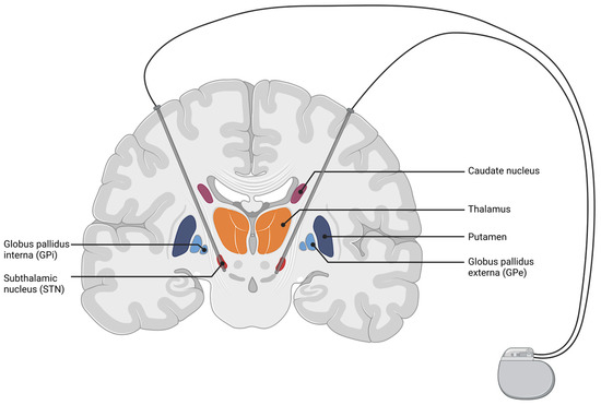 Deep brain stimulation (DBS) was introduced as a treatment for movement disorders in 1987, when A. Benabid implanted deep brain electrodes in the ventral intermediate nucleus of the thalamus (VIM) to treat severe tremor in essential tremor (ET) or Parkinson’s disease (PD) [125,126]. To date, DBS has proven to be effective and reached FDA approval for several indications, such as advanced PD, ET, medication refractory epilepsy, and has gained FDA humanitarian device exemptions for idiopathic dystonia syndromes (iDS) and obsessive-compulsive disorders. The neuroanatomic target structures include the subthalamic nucleus (STN), VIM, the internal part of the globus pallidum (GPi), the thalamic anterior nuclei, and the crus anterior of the internal capsule. A schematic illustration of STN-DBS is shown in Figure 2.