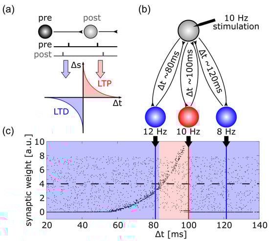 Animal experiments can investigate synaptic plasticity by stimulating the pre-synaptic neuron and recording from the post-synaptic neuron. Such experiments have revealed that synaptic weights change depending upon the relative timing of pre- and post-synaptic spikes, a rule that is referred to as spike-timing dependent plasticity ((STDP) see Figure 4a). A simulation using artificial neural networks has tested whether this synaptic mechanism was susceptible to repetitive stimulation and could be responsible for the after-effects of tACS [219]. As shown in Figure 4b, neurons were interconnected with axons of different axonal delay times representing different resonance properties of the established neuronal loops. When this network was stimulated with a spike train of 10 Hz and synapses were updated according to the STDP rule, the synapses were strengthened that were incorporated in loops with resonance frequencies at the stimulation frequency and slightly above (Figure 4c).