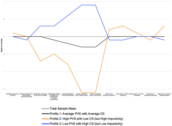 Our data best supported a three-profile model based on recommended decision criteria for evaluating latent patterns (Table 2) [74]. Specifically, the model fit indices for the three-profile model indicated lower AIC and BIC values than the four-profile solution, a significant Vuong Lo Mendell Rubin adjusted p-value (p = 0.036), and an entropy value of 0.77). Each of the three profiles were adequately populated (profile 1, n = 4940; profile 2, n = 1470; profile 3, n = 4004; Table 1), which was not true for the other profile solutions. Furthermore, the three-profile model yielded conceptually meaningful configurations of participant profiles: (1) average PVS and CS, (2) high PVS with low CS (high impulsivity), and low PVS with high CS. The three profiles were statistically different (p = 0.036) in PVS, CS, ALC, and STBs, but not co-occurring ALC + STBs (Table 1, Figure 1).