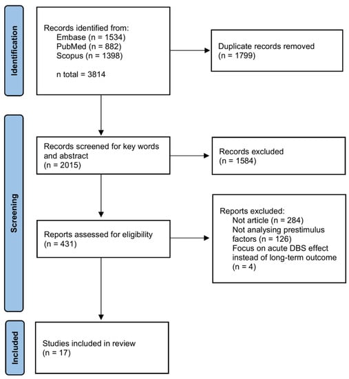 A total of 3814 articles were identified from 3 databases. We first removed 1799 duplicates. Second, we screened keywords and abstracts for articles containing both DBS and OCD. A total of 431 articles were left for the full-text assessment. Then, we removed 284 articles that were not articles, including reviews, conference papers, proceeding or abstracts, book sections, commentaries or case reports. In addition, 126 articles were rejected by authors for not providing correlation analyses for treatment outcomes and pre-stimulus factors, and 4 articles only investigated acute DBS effect instead of long-term outcome [24,25,26,27]. Finally, 17 articles were included in this review. The PRISMA flow chart of our study selection is shown in Figure 1.