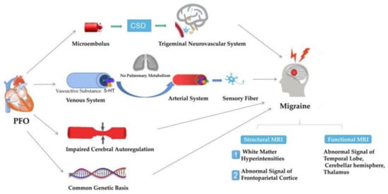 In order to explore the potential mechanism of the correlation between PFO and migraine, researchers are committed to studying the pathophysiology of both PFO and migraine. In 2004, the genetic mechanism was first found to be involved [], which attracted the attention of scholars. In addition, with the wide application of brain imaging technology, neurologists try to use neuroimaging to find the structural and functional changes in the brain in migraine patients with PFO [,], and we introduced this in detail below.