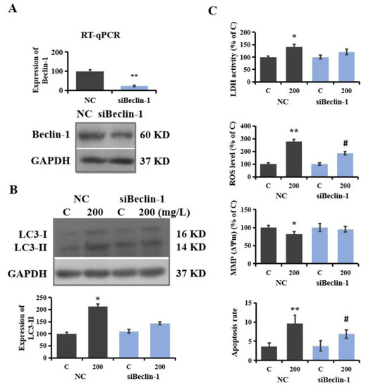 Autophagy-regulated neurotoxicity induced by PS-NPs. (A): SHSY-5Y cells were transfected with sh-pBeclin-1 and sh-pGIPZ plasmids to construct Beclin-1 RNAi cells (siBeclin-1) and negative cells (NC). The expression of Beclin-1 was analyzed with RT-qPCR and Western blotting. NC and siBeclin-1 cells were treated with 200 mg/L of PS-NPs, and then the expressions of LC3-II were measured with Western blotting, and the expressions of proteins were quantified (B). The LDH activity, ROS level, MMP, and apoptosis rate were measured (C). In the C (control) group, SHSY-5Y cells were only treated with medium. * p < 0.05 and ** p < 0.01, compared to the control. # p < 0.05, siBeclin-1 group compared to the NC group.