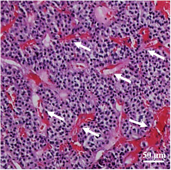 HE staining of a PA, revealing a “chicken-wire” vascular structures (white arrows).