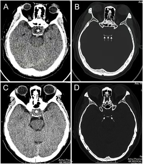 The erosion of the dorsum sellae bone: (A,B) intrasellar PA (asterisk) with an enlarged sella and an intact dorsum sellae bone (white arrows); (C,D) Intrasellar PA (asterisk) with an enlarged sella and erosion of the dorsum sellae bone (white arrows).