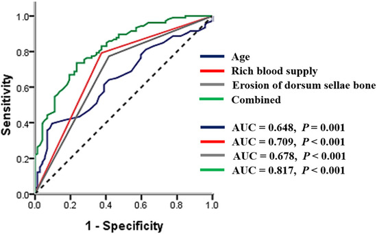 In order to further analyze the predictive value of relevant risk factors on Ki-67 index, ROC curve models were constructed and analyzed (Figure 3). The AUC value of age was 0.648 (95% CI: 0.568–0.728), the rich blood supply was 0.709 (95% CI: 0.629–0.789), and erosion of the dorsum sellae bone was 0.678 (95% CI: 0.596–0.761) (Table 3). The combined AUC value was 0.817 (95% CI: 0.756–0.879), the sensitivity was 73.60%, and the specificity was 76.40%. These results indicated that the combined application of the three factors had a good ability to predict Ki-67 index.