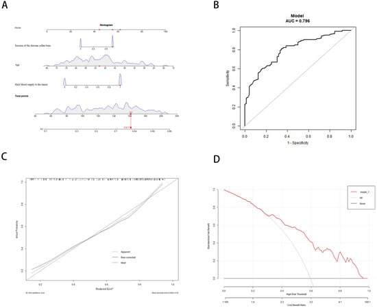 Use of a nomogram to predict the state of Ki-67: (A) Clinical and radiological results correspond to a particular point by drawing a straight line up to the point axis. The summary point represents a high (≥3%) probability of Ki-67 when the summary point is located on the total point axis. (B) The calibration curve of the model was consistent with the predicted and observed results. (C) The ROC curve was constructed to evaluate the nomogram identification ability. (D) The ordinate is represented by the net benefit rate, and the abscissa is represented by the high-risk threshold to plot DCA.