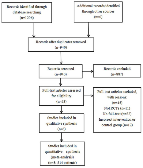 In the meta-analysis, 940 independent studies were originally verified in electronic databases, after 266 copies were removed. A total of 53 studies qualified for a further full text search, of which 45 studies did not satisfy the included standard, which left eight studies (with 514 patients) contained in the final study. The flow diagram with specific data is summarized in Figure 1 [21,22,23,24,25,26,27,28].