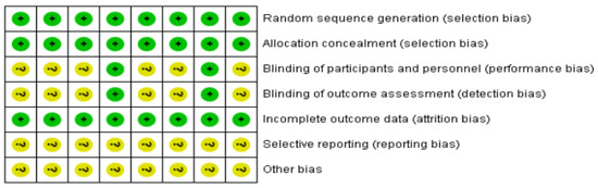 Risk-of-bias assessment based on review author’s judgment about the risk-of-bias item for each eligible study (n = 8). +, low risk of bias; ?, unclear risk of bias [21,22,23,24,25,26,27,28].