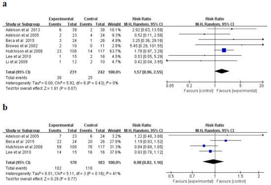 For mortality (%), the random influences model was applied and no significant non-homogeneity was explored in the research (I2 = 0%, p = 0.43). The meta-analysis indicated that the hypothermia therapy part had a higher mortality than the normothermic therapy part (Figure 3a), but the difference was not statistically significant (p = 0.07). The incidence of complications was a random-influence model, and no significant heterogeneity was found in the study (I2 = 41%, p = 0.16). The meta-analysis indicated that the hypothermia therapy part had a lower occurrence rate of complications than the normothermic therapy part (Figure 3b); however, the distinction was not evident in the statistics (p = 0.77). The sensitivity study showed that the consequences of the two indications were reliable and did not rely on any single study.