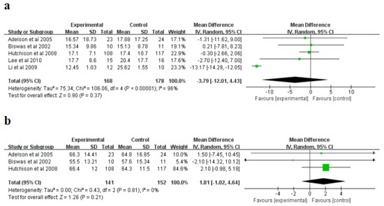 Forest plots of the meta-analysis of intracranial pressure (ICP) (a), and cerebral perfusion pressure (CPP) (b). IV, inverse variance [21,24,25,26,27].