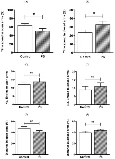 PS increases the risk for mental illness in the offspring, such as anxiety [4]. We then assessed anxiety-like behavior in rats based on behaviors in response to a novel set in the EPM, reflecting a conflict between their innate need to explore new surroundings and liking for a dark-enclosed space, which can provoke an avoidance of a high-open area [31,32]. Decreased time spent in the open arms and/or reduced number of entries into the open arms indicate anxiety, while the number of closed arms entries indicates spontaneous motor activity [31], as well as the distance traveled in each area was also measured [32]. As a result, the percent of time spent in the open arms (Figure 1A) was significantly lower in PS adolescent pups than controls, consistent with more time spent in the closed arms (Figure 1B), suggesting higher anxiety in PS male rats. However, the number of entries into the open arms (Figure 1C) and closed arms (Figure 1D), also, the distance traveled in the open arms (Figure 1E) and closed arms (Figure 1F) showed non-significance, implying no difference in the locomotor activity between groups.