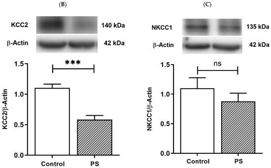 Developmental shift of cation–chloride cotransporters. (A) Immunohistochemical staining of KCC2. Expression in the medial prefrontal cortex between the control (left) and prenatal stress (PS) (right) groups; white arrows indicate KCC2-positive cells (upper; red) merged with the nuclear stain DAPI (lower; blue), scale bar = 20 µm. (B) Western blotting of KCC2. Upper, band comparing the control (left) and PS (right) groups; lower, bar graph displays the analysis of protein band densities of the KCC2/ß–actin ratio; the significant differences at *** p < 0.001. (C) Western blotting of NKCC1. Upper, band comparing the control (left) and PS (right) groups; lower, bar graph displays the analysis of protein band densities of the NKCC1/ß–actin ratio; non-significance (ns) was found. Data are shown as the mean ± SEM, n = 5.