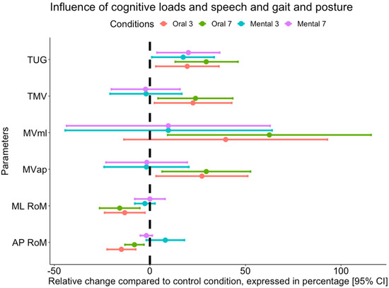 There was no significant effect of cognitive load level for the MVml (5 [−18; 29]%, p = 0.334), MVap (0 [−25; 26]%, p = 0.961) and TMV (1 [−22; 2]%, p = 0.842) for the oral condition. We observed the same results on MVml (5 [−11; 21]%, p = 0.389), MVap (8 [−13; 29]%, p = 0.429) and TMV (6 [−12; 25]%, p = 0.411) for the mental condition. The cognitive load level affected the TUG only in the oral condition: CLO (−11 [−26; −13]%, p = 0.00025), CLM (−3 [−11; −6]%, p = 0.16).