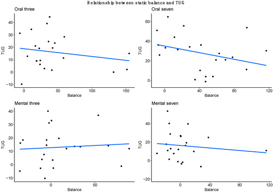 Finally, to compare the static and dynamic (TUG) aspects, we compared the relative changes (in comparison with the control condition) induced by the different cognitive tasks on balance and TUG. We did not find a correlation between these changes for any of the studied conditions (R = 0.20 for Oral 3, 0.36 for Oral 7, 0.08 for Mental 3 and 0.11 for Mental 7, see Figure 3).