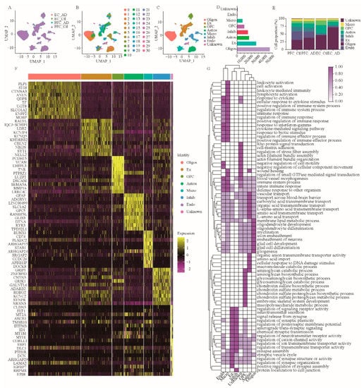 All snRNA-seq data were obtained from Gene Expression Omnibus (GEO) (https://www.ncbi.nlm.nih.gov/geo/ (accessed on 21 December, 2021)): GSE141552 (containing 4 prefrontal cortex samples from 4 controls), GSE157827 (containing 14 prefrontal cortex samples from 6 controls and 8 AD patients), and GSE138852 (containing 12 entorhinal cortex samples from 6 controls and 6 AD patients). In GSE141552, data from alcoholics were excluded because prolonged alcohol abuse caused individual mental loss, poor attention, and memory loss, which did not meet the inclusion criteria for the AD study. In GSE157827, compared to other samples, 3 controls and 3 AD were discarded, as a result of small number of cells and genes. In the GSE138852 dataset, there was a total of 16 samples (containing 8 controls and 8 AD patients). However, 2 AD and 2 controls were discarded because of abnormal high neuronal enrichment. The first two datasets were obtained using the 10× Genomics platform and NovaSeq 6000 sequencing platform, and the additional datasets using the 10× Genomics and NextSeq 500 sequencing platforms [17,18,19]. The proteomic data was obtained from the Proteome Xchange Consortium: PXD011482 (containing 6 AD and 5 controls).