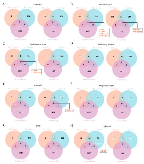 The Venny map overlapped the DEGs of prefrontal cortex and entorhinal cortex and DEPs of serum of AD patients. (A–H) The DEGs/DEPs for 8 cell types, including astrocytes (A), endothelial cells (B), excitatory neurons (C), inhibitory neurons (D), microglia (E), oligodendrocytes (F), OPC (G), unknown cells (H).