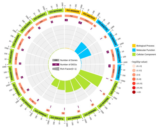 GO functional analysis of DEGs. The yellow area in the figure represents the biological process of DEG. The blue area in the figure represents the molecular function of the DEGs. The green area in the figure represents the cellular component of the DEGs.