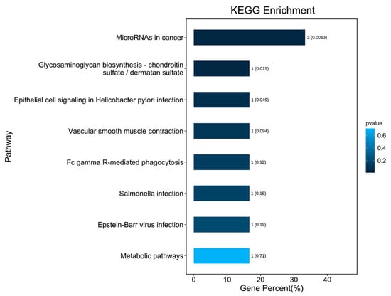 KEGG signaling pathway enrichment analysis for 10 DEGs. The bars indicate the percentage of genes involved in pathway terms; the numbers beside the bars indicate the gene number, and numbers in parentheses represent the p value.