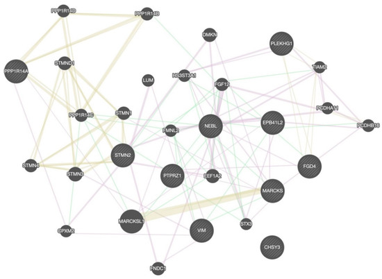 KEGG pathway enrichment analysis was conducted on those 10 DEGs to further elucidate their potential function, in which 8 pathways were screened out (Figure 4), including microRNAs in cancer, glycosaminoglycan biosynthesis, chondroitin sulfate/dermatan sulfate, Epithelial cell signaling in helicobacter pylori infection, vascular smooth muscle contraction, Fc gamma R-mediated phagocytosis, Salmonella infection, Epstein–Barr virus infection, and metabolic pathways. The PPI network with obvious interaction relationship for all DEPs included 30 nodes and 119 edges (Figure 5). Then, the top five proteins with the max number of interactors were NEBL, STMN2, MARCKS, VIM, and FGD4.