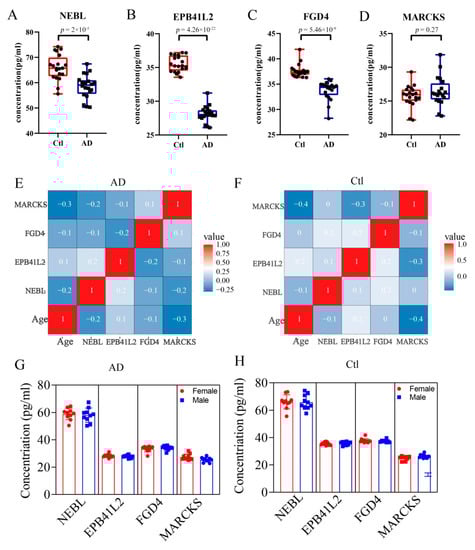 Changes of expression of hub DEPs in the serum. The se-rum concentration of NEBL (A), EPB41L2 (B), FGD4 (C), and MARCKS (D) in control and AD groups. (E,F) Correlation analysis of age with the four molecules in the AD and control groups, respectively. (G,H) The differential expression analyses of these molecules between female or male populations in the AD and control groups, respectively.