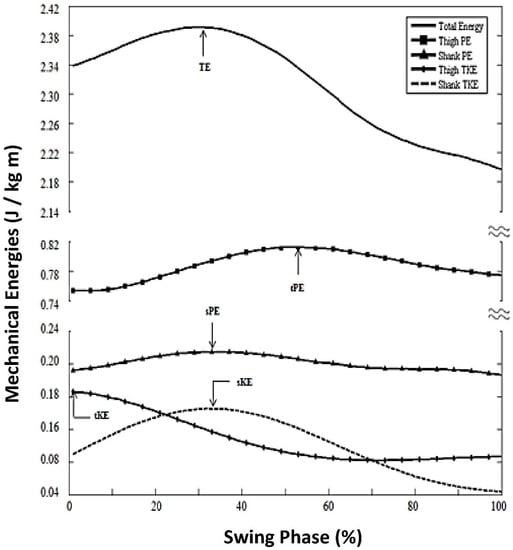 - Earlier total energy (TE) peak and then a drastic decrease until heel strike (Figure 4b, solid line).