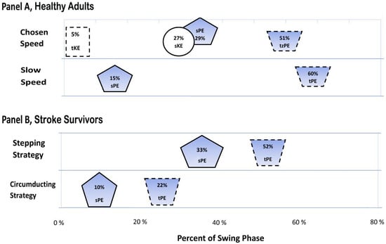 - sPE peaked later in the swing phase at 33% (±17) of the gait cycle for stroke stepping strategy versus slow healthy adults at 15% (±7); p = 0.002, Figure 2, comparing Panel B, stepping strategy versus Panel A, healthy adult slow speed).