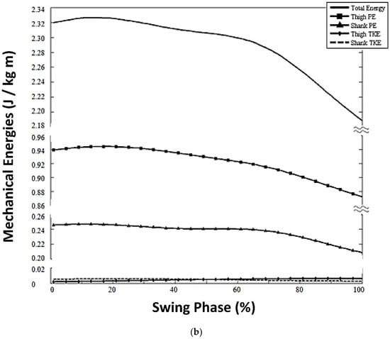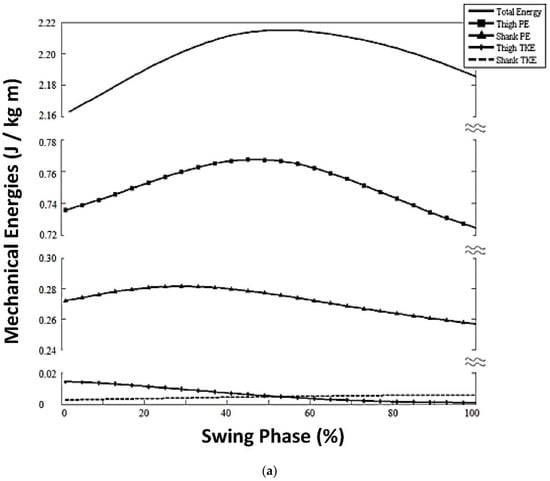 We can note that in chosen speed walking for healthy adults, it is well-known that knee flexion movement during the early swing phase is accomplished with no muscle activations [], but to our knowledge, to date, there is no available quantitative information explaining this phenomenon. Our results provide the quantitative evidence of the underlying mechanism that makes this possible. That is, our results showed that KE and PE interactions within the thigh and across the shank and thigh precisely utilize and expend mechanical energies in such a manner as to not only conserve mechanical energies, but also produce the knee flexion movement in the early swing phase, without the need for muscle activation of knee flexors in early swing.