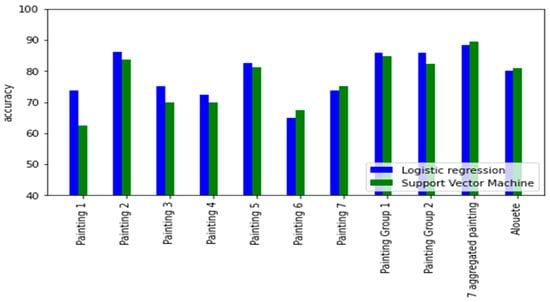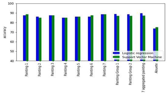 Figure 5 presents the accuracy of the two models (support vector machine and logistic regression). For the three analyses (for each of the ten painting datasets), the score on the test set was overall the same. In other words, the generalization ability of each of the linear and nonlinear models has slightly improved when considering augmenting the sample size of the used dataset.