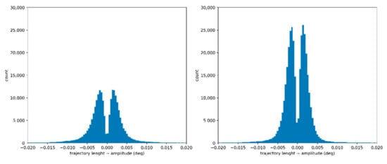 The left histogram corresponds to the non-dyslexic population, while the right histogram corresponds to the dyslexic population. The two histograms were computed using 100 bins, showing a statistical distribution with two main modes that correspond to the peak of micro convergence and micro divergence amplitude segments.