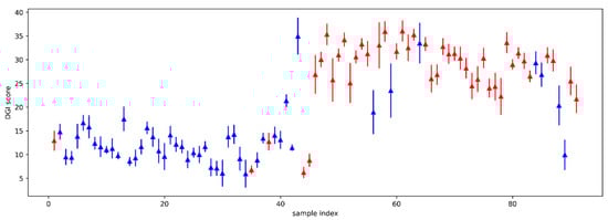 In addition, in Figure 4, we present the variability of the DGI score over the seven paintings dataset for each individual. The dyslexic population is represented using the red color and the non-dyslexic population is represented using the blue color. For the two populations, the variability of the DGI over the seven paintings is quite low.