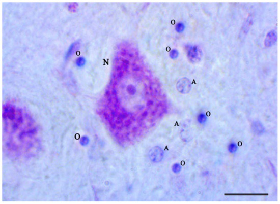 Photomicrographs of the Nissl-stained section are presented in high magnification. The scale bar represents 10 µm. In the Nissl-stained image: N = neuron, O = OLG, A = astrocyte. At higher magnification, note the presence of OLGs in the vicinity of the neurons and astrocytes in the brain. Astrocytes can be distinguished because of a characteristic pale nucleolus.